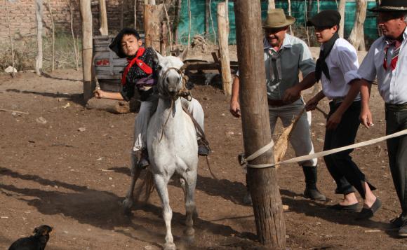 Lautaro Castro es el más joven de la familia. Tiene 7 años, pero su corta edad no es impedimento para ofrecerse a ser el primero en montar al ’chúcaro’. Se demoró más de lo habitual en prepararse. Es que tuvieron que enroscarle en el tobillo con varias vueltas la correa de las espuelas para que no las perdiera durante la doma, porque los accesorios no vienen en tamaño chico. ’Hay ponis que se empacan y no quieren corcovear por eso hay que darle un toquecito con las espuelas. Hay que hacerlo con cuidado para no lastimarlos ni para que salgan como locos’, dijo Lautaro que, por su baja estatura, tuvo que contar con asistencia para subir al poni. Lo ayudaron Lucas y Martín, sus hermanos de 14 y 15 años que también se dedican a la doma. Los tres quisieron seguir los pasos de su padre. ’Quisimos empezar a jinetear porque nos gusta y porque quisimos seguir el ejemplo de nuestro padre. Recién estamos agarrándole la mano, aunque es muy difícil ya que es algo que uno aprende solo y sin entrenarse. Ninguno tiene un poni chúcaro, es por eso que montamos uno únicamente cuando vamos a una doma’, dijo el mayor de los hermanos.