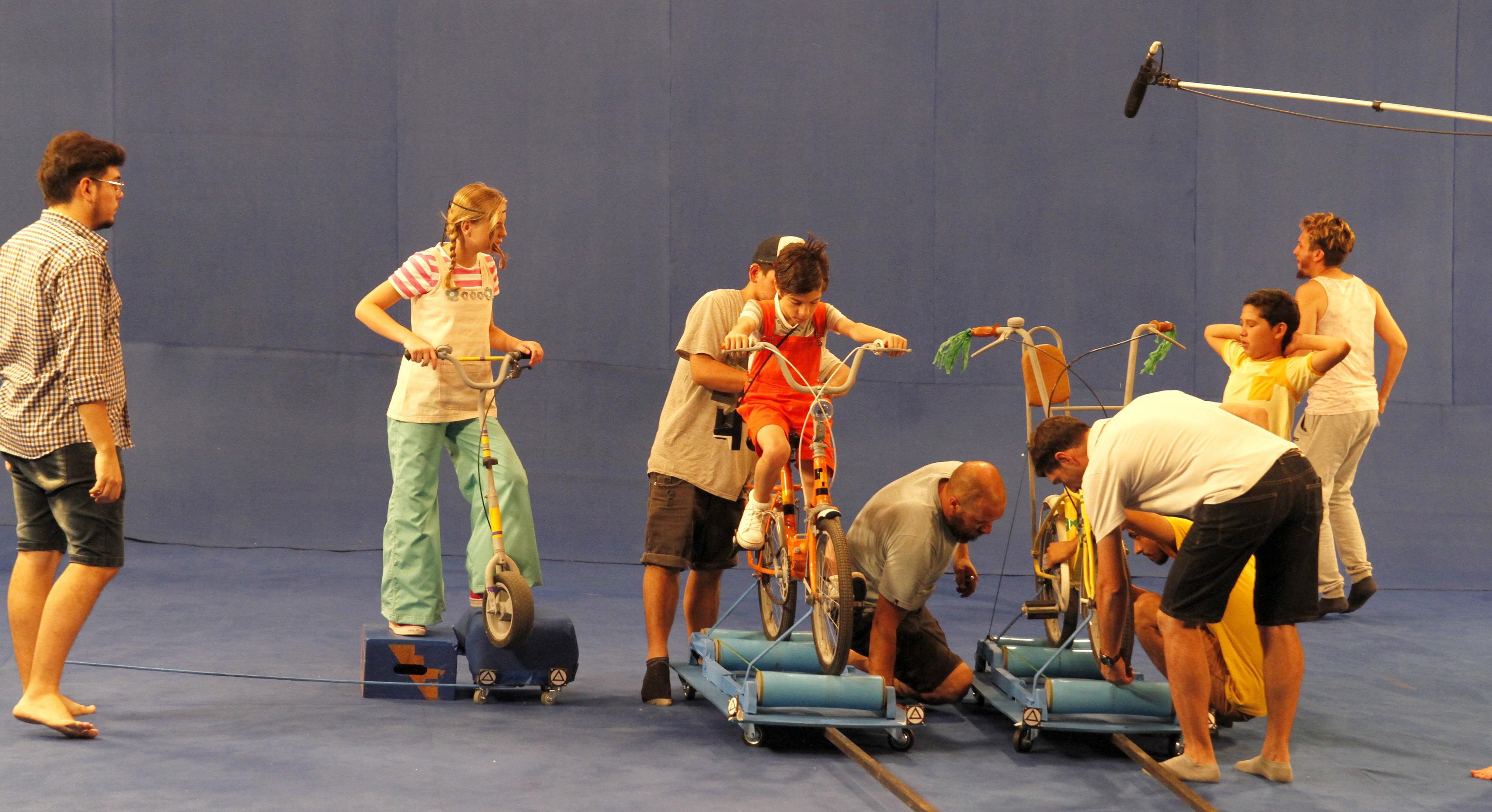 Asistencia. Durante el rodaje los técnicos arreglan las bicicletas en las que los chicos simulan andar en la siesta para perseguir a la pericana.