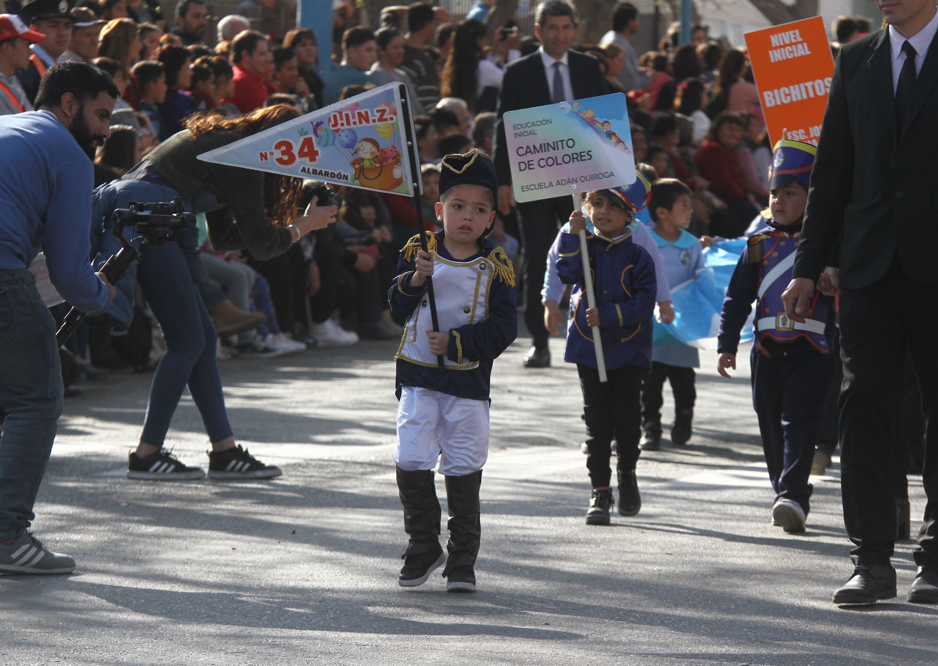 Pequeños patriotas. Los alumnos del JINZ 34 desfilaron caracterizados de San Martín y de granaderos.