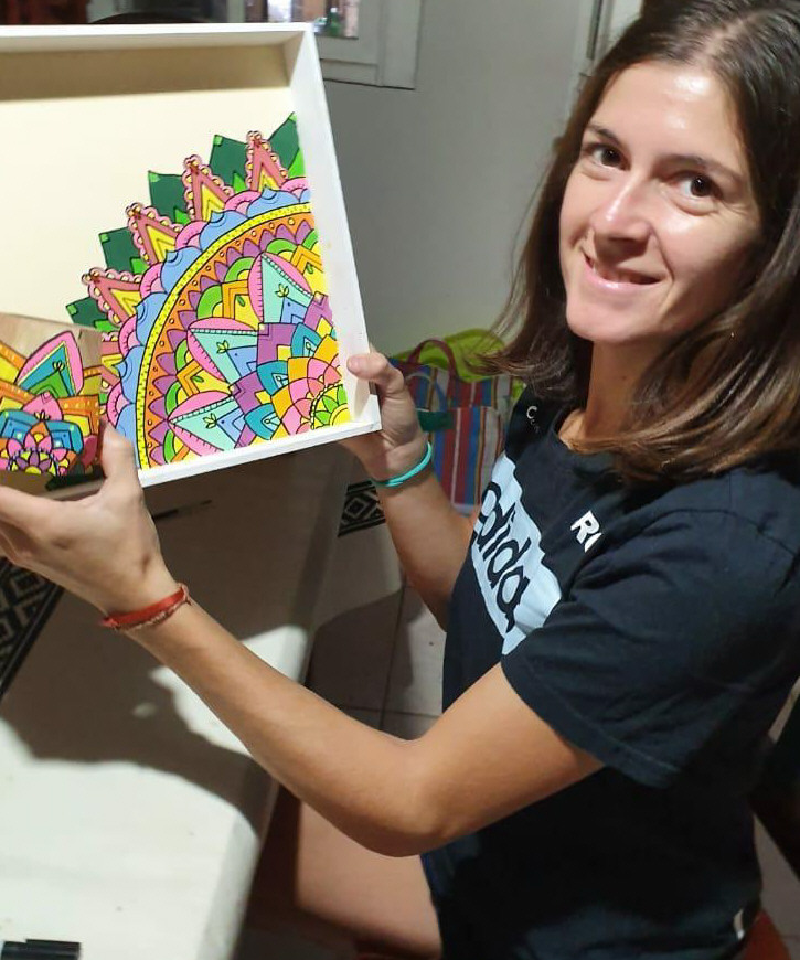 Talentosa tanto en el hockey sobre patines como en el de césped o pista, "Luchi" Agudo contó que en las rutinas físicas que le preparó su hermano para que realice durante la cuarentena, se pone a improvisar con los sticks para pasar el tiempo, aunque sus manos hoy están también ocupadas en otras tareas creativas: "Me gustan las artesanías. Ahora estoy pintando un mate y la bandeja y después sigo con una repisa para guardar los elementos".