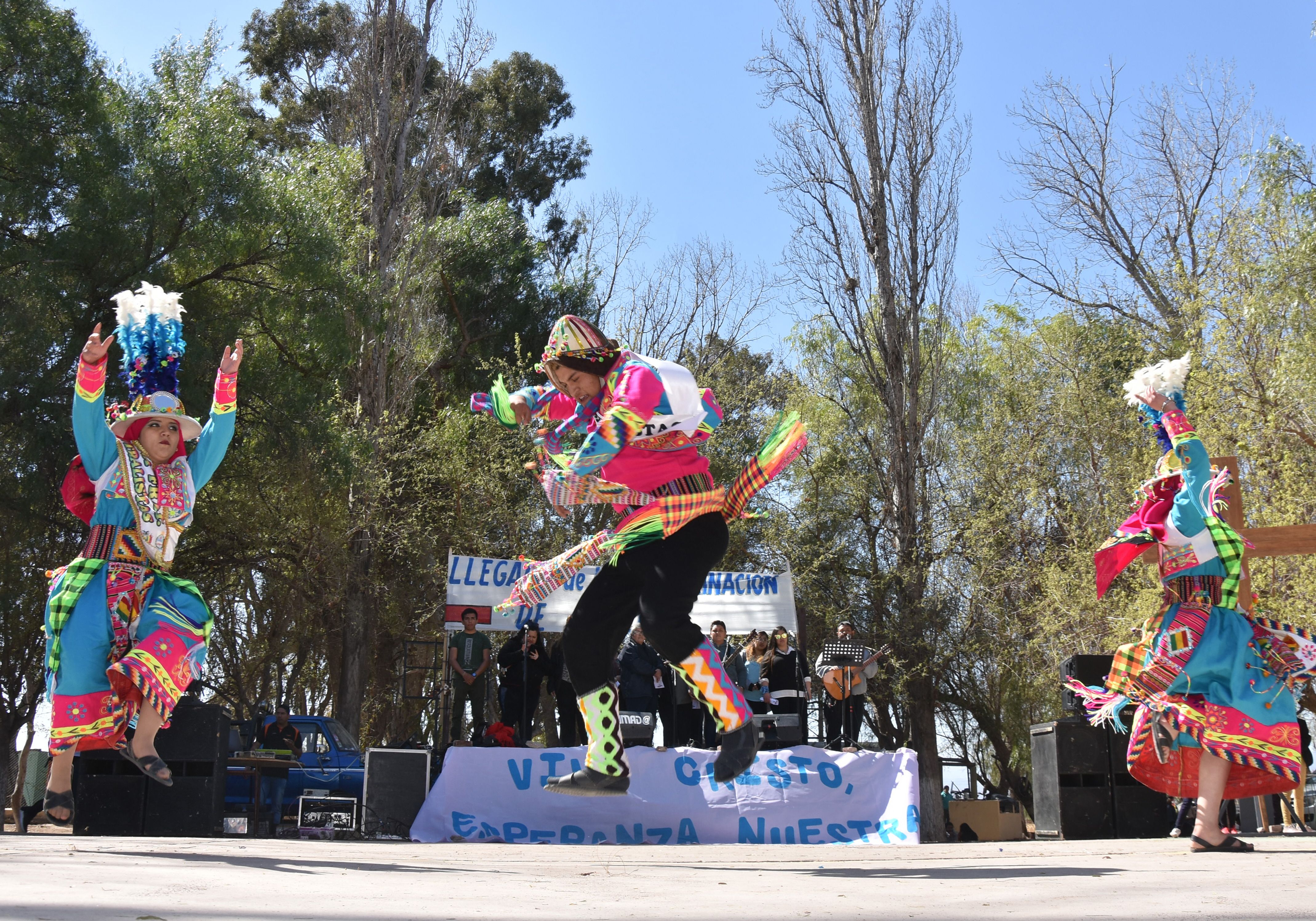 Show. Danzantes de la Virgen de Copacabana bailaron ritmos tradicionales de Bolivia para acompañar a los peregrinos que luego coparon el escenario.