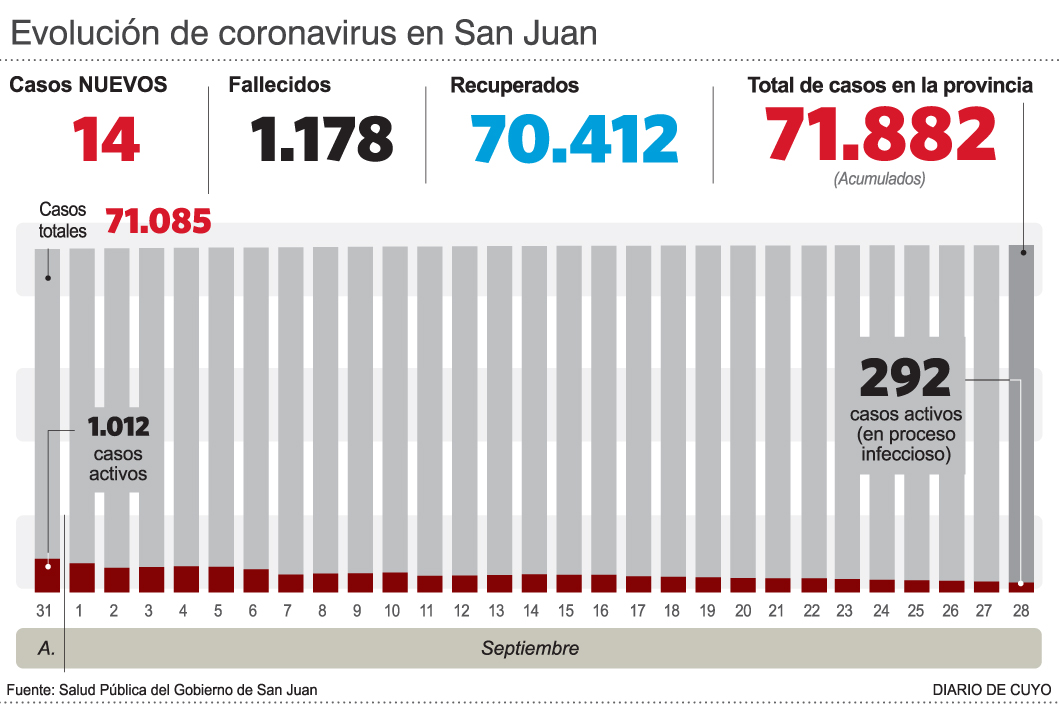 Salud Pública informó ayer la muerte por covid de tres personas. Se trata de dos hombres de 54 y 73 años y una mujer de 90, por lo tanto el total de fallecidos es de 1.178. A su vez, hubo 14 positivos y el acumulado se eleva a 71.882 infectados; mientras que los casos activos apenas son 292.