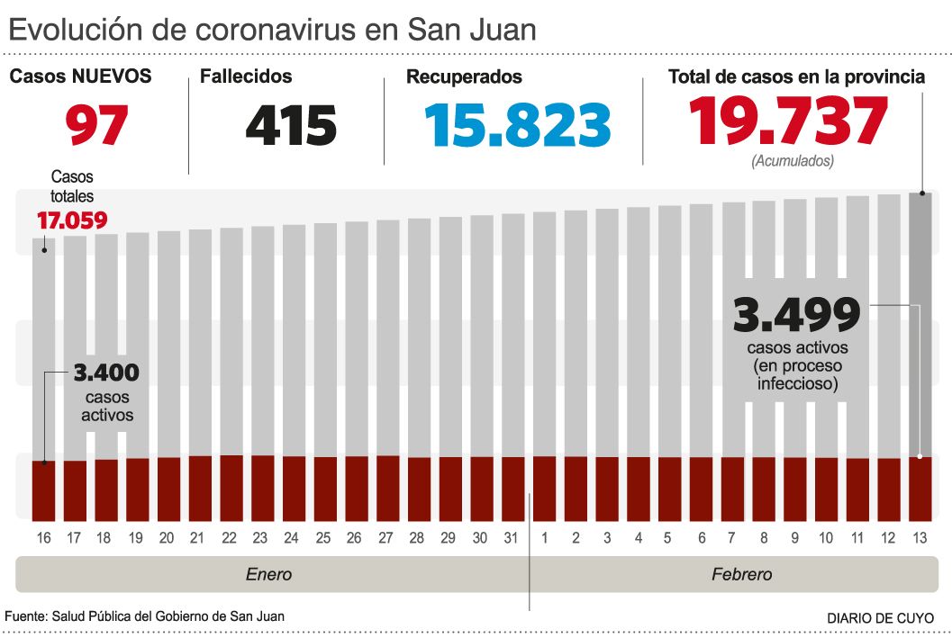 Por su parte, ayer hubo 97 test que dieron positivo y por lo tanto el acumulado se acerca cada vez más a las 20.000 personas. En detalle hay en total 19.737 confirmados con Covid, de los cuales 3.499 son individuos que atraviesan procesos infecciosos en curso. Hay, además, 44 internados en áreas críticas (21 con asistencia respiratoria mecánica).