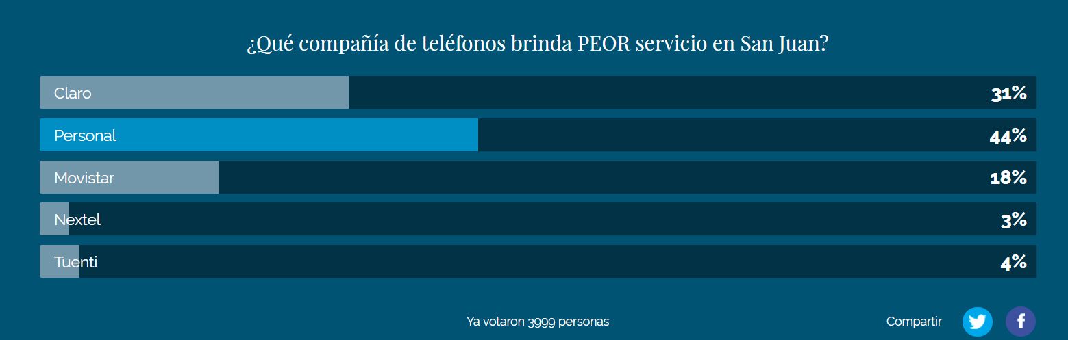 Así las cosas, DIARIO E CUYO realizó una consulta entre sus lectores para saber cuál es la empresa que en San Juan brinda el peor servicio. Sobre 3999 votantes, el 44% eligió a Personal como la que arroja mayores problemas en el servicio.