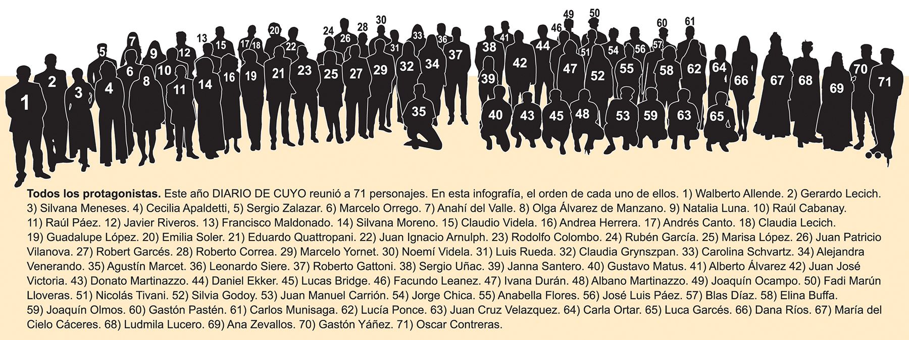 Políticos, deportistas, artistas y personas desconocidas para la opinión pública demostraron pasión por lo que hacen y esto los llevó a conquistar grandes logros y reconocimientos. Por estas razones fueron protagonistas de las páginas de DIARIO DE CUYO durante el 2022, y que hoy vuelve a mostrarlos porque merecen un reconocimiento. En una postal clásica de este medio, 71 sanjuaninos respondieron a la convocatoria para formar parte de la tradicional foto de los Personajes del Año.