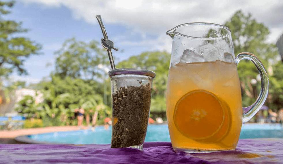 La forma tradicional es colocar agua con hielo en una jarra y unas rodajas de limón, naranja o cualquier cítrico a elección y cebar en un recipiente con yerba.