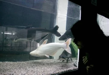 Se mueven lentamente. No está permitido usar cámaras fotográficas con flash porque el cambio abrupto de luz los pone nerviosos. Ahora se puede ver de cerca su piel, que parece de neoprene. Y el que más llama la atención es el albino. Están ubicados en la pecera mayor del flamante acuario. Al lugar se lo denomina "la isla" y fue construido especialmente para contener a los 6 tiburones asiáticos, o pangasius. Estos son la gran vedette del lugar, que fue reinaugurado ayer en el Parque Faunístico que está en Rivadavia.