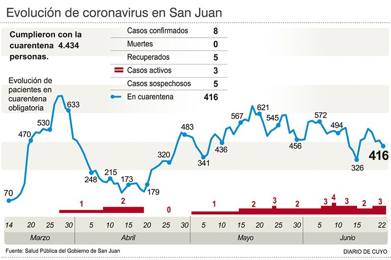 Los restantes dos casos de coronavirus detectados en lo que va del mes en San Juan fueron jóvenes repatriados que llegaron de Estados Unidos y México, que se encontraban en hoteles cumpliendo el aislamiento obligatorio y que dieron positivo en los hisopados de control (una persona ya está de alta y la otra espera un nuevo análisis, esta semana).