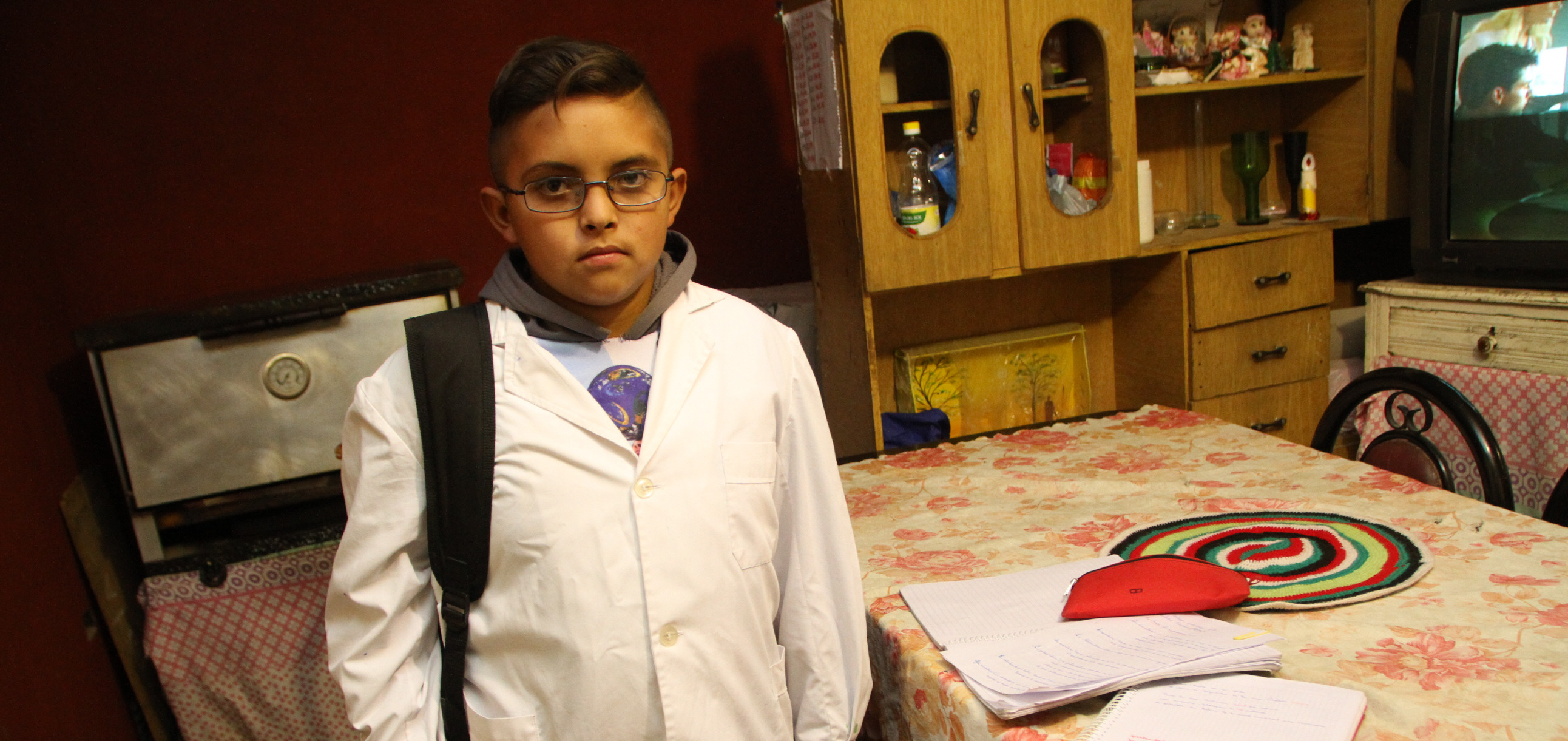 ­Santiago Gutiérrez, de 11 años, cursa el 6to grado en la Escuela Honorio Pueyrredón de Villa Morrone donde trascendió como el alumno con mejor conducta y calificaciones. Este año alcanzó un promedio de 9,95, pese a los esfuerzos que realiza para estudiar, ya que a veces debe trabajar para contribuir con la economía de su hogar. Sus padres no tienen trabajo y viven de las ganancias que les deja la venta de las semitas que ellos mismos amasan durante la madrugada de cada día. Cuando su papá tiene que hacer trámites o está enfermo, Santiago se encarga de hacer el reparto, pero sin descuidar el estudio. Mientras recorre los negocios va estudiando para las evaluaciones. "Me encantaría poder seguir estudiando y terminar el secundario porque estudiar es lo más importante que tenemos en la vida. Mis papás sólo pudieron terminar la primaria, por eso yo me esfuerzo para ser un buen alumno así ellos se sienten orgullosos de mí", dijo el nene.