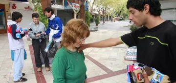 Los paquetes de medias atraen con su colorido, mientras ellos, de pie y a voz en cuello, ofrecen su mercadería a la gente que pasa. "Tres pares por 10 pesitos", dice Miguel y enarbola las medias que reproducen las figuras de Ben 10 para los varones, o de Barbie, para las nenas. Más allá, en la misma cuadra de la Peatonal Sarmiento, Maxi ha colocado su mano sobre el hombro de una joven y con los ojos cerrados, dice una oración por ella. Es la hora del cierre de comercio y los pocos que todavía quedan circulando por la Peatonal se apuran para llegar a la parada del colectivo que les permita volver rápido a su casa. El cuadro es, cuando menos, extraño, pero nadie parece reparar en ello. Maxi termina su oración, dice una bendición y la joven se va, agradeciendo en voz baja. Entonces, él vuelve a tomar los paquetes de medias en las manos como si fueran ramos de flores y a intentar una última venta de la jornada.