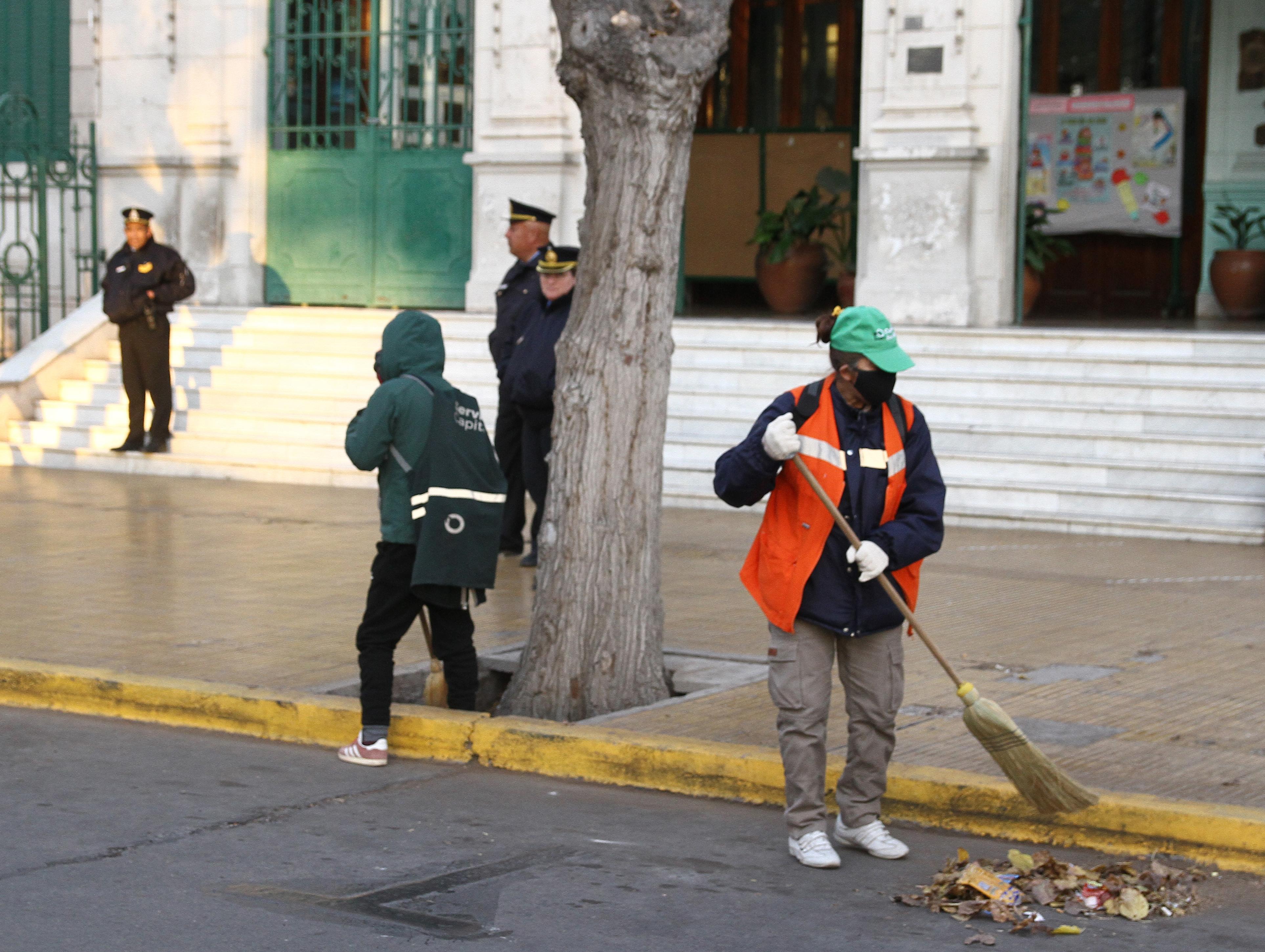 Cuando sólo había pasado media hora de que las escuelas habían abierto sus puertas, en las instituciones del centro los barrenderos hacían que las veredas lucieran limpias.