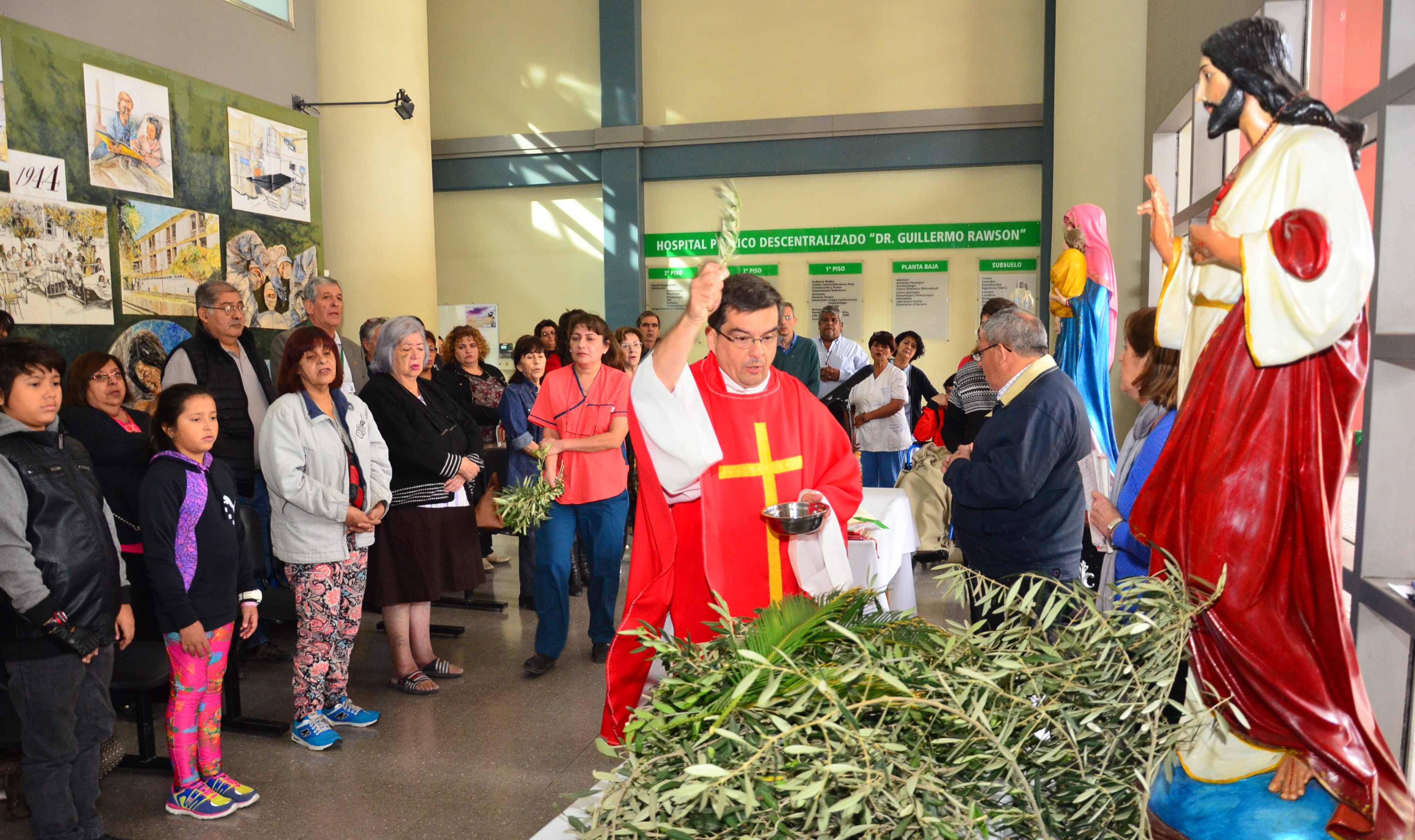 Por una hora, parte de la rutina diaria del Hospital Rawson cambió por completo. Enfermeras, médicos y gente que esperaba ser atendida o visitar a algún paciente internado, se concentró en el hall central para participar de la Misa de Ramos. Fue el padre Daniel Sebastian el encargado de realizar la ceremonia. Todo esto fue organizado por la Pastoral Hospitalaria Nuestra Señora del Rosario.