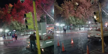 Pese al peligro que representaba tanto para peatones como para automovilistas, la empresa contratista enviada por la Municipalidad de la Ciudad tardó cuatro horas en llegar al lugar y retirar la señalización. Finalmente, en pocos minutos, el semáforo fue removido.Policías habían colocado conos para evitar que la gente pasara por ahí.