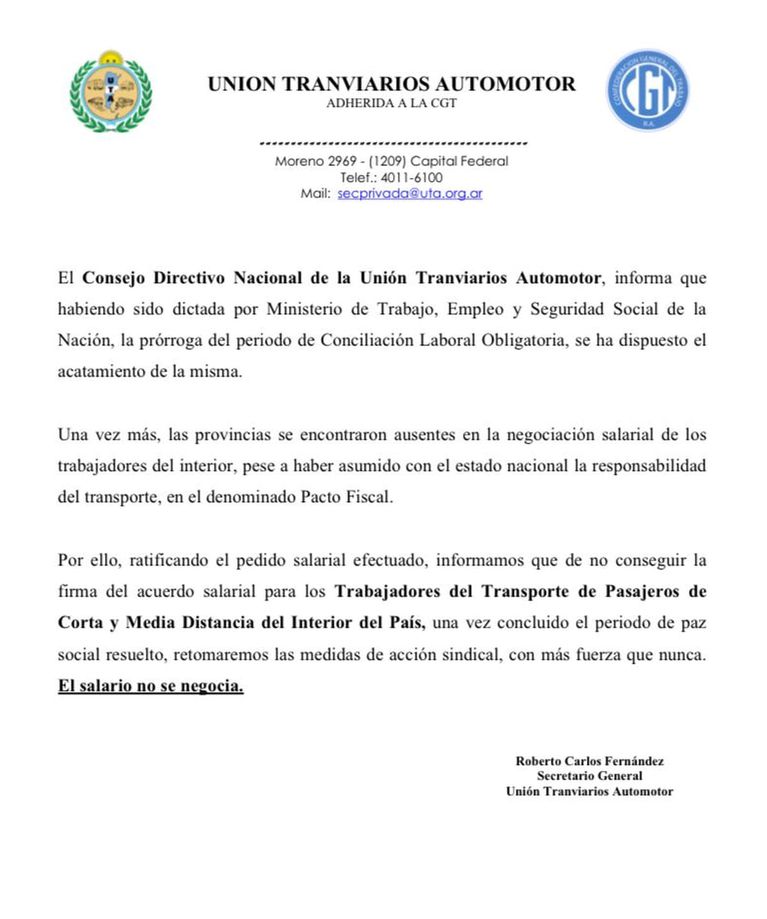"El Consejo Directivo Nacional de la Unión Tranviarios Automotor, informa que ha sido dictada por el Ministerio de Trabajo, Empleo y Seguridad Social de la Nación, la prórroga del periodo de conciliación laboral obligatoria, se ha dispuesto el acatamiento de la misma", indicaron desde el sindicato en un comunicado.