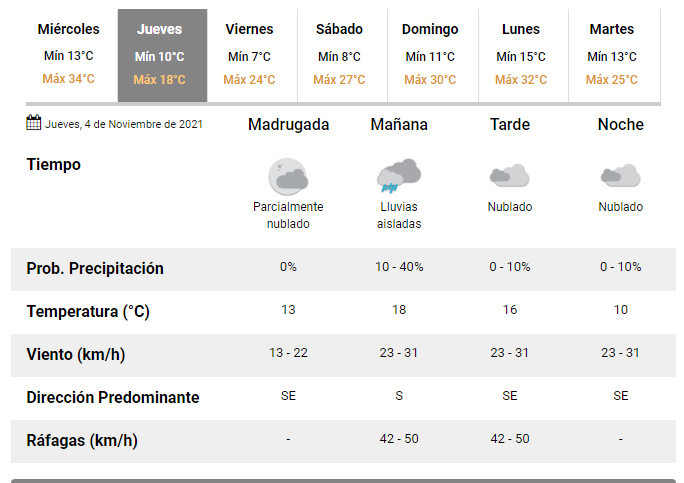 La jornada se presentará con cielo parcialmente nublado, lluvias aisladas durante la mañana y nublado durante el resto del día. Además, pronostican que las ráfagas del sur se sentirán en la mañana del jueves y alcanzarán una velocidad entre 42 y 50 km/h.