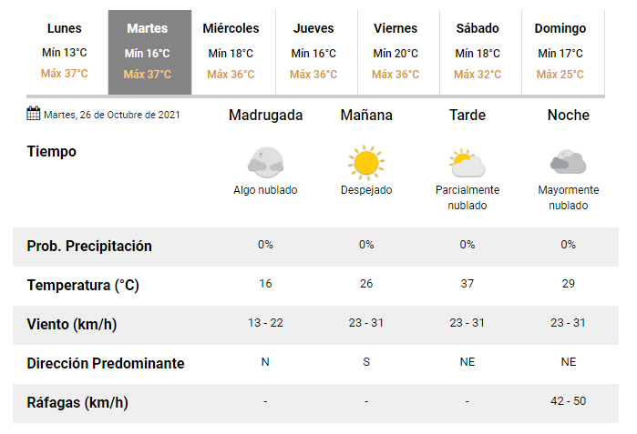Para el martes, la máxima alcanzará los 37°C y la mínima caerá hasta los 16°C. La jornada iniciará con cielo algo nublado, se despejará en la mañana y estará parcialmente nublado en la tarde-noche.