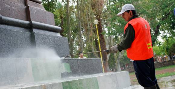 Por último los operarios comenzarán hoy a limpiar los bancos de la plaza y utilizarán el mismo método con el que removieron la pintura de la estatua.