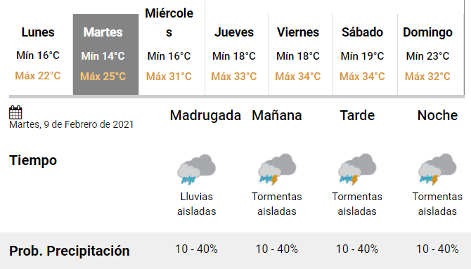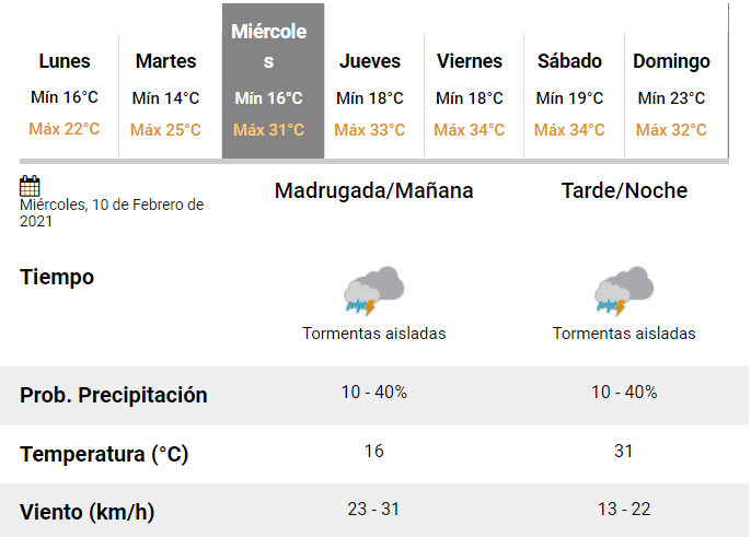El área será afectada por tormentas, algunas fuertes, que pueden estar acompañadas por ráfagas, ocasional caída de granizo y abundante caída de agua en cortos períodos. Se esperan valores de precipitación acumulada entre 20 y 40 mm, pudiendo ser superados en forma puntual.