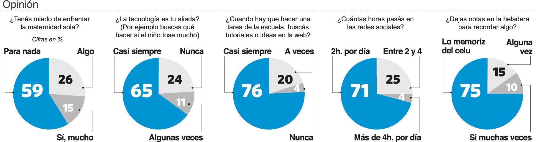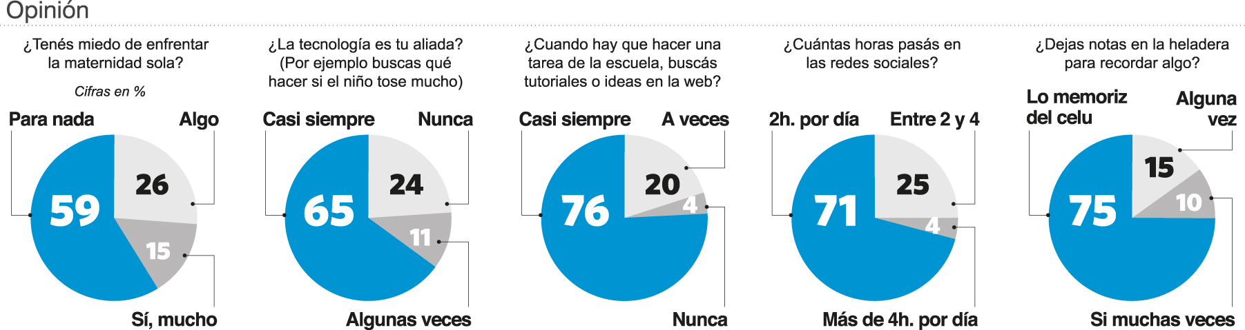 Le encuesta (que fue realizada por la consultora IOPSS para este medio) sacó a la luz esta nueva forma de maternidad que está formada por mujeres con mucho trabajo, que estudian, hacen actividad física y hasta tienen tiempo de salir con amigas. Las mamás de la Generación Y (como también se les dice a la millennials) se dan tiempo para todo y muchas usan la tecnología para sentirse más cerca de sus hijos permanentemente. Algunas aprovechan los recreos laborales para hacer videollamadas a sus pequeños y hasta chequean por internet las notas que sus hijos sacan en las evaluaciones escolares. Del 65% que respondió que la tecnología es su aliada (163 mamás), la mayoría dijo que tiene un sólo hijo. Por otra parte, del 24% que respondió que la tecnología nunca es su aliada la mayoría tiene más de un hijo.