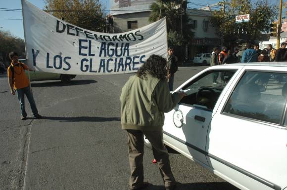 Los asambleístas desplegaron sus pancartas y repartieron volantes que destacaban en fondo negro "La presidenta vetó el año pasado la ley que defendía nuestros glaciares. ¡Defendamos el agua y los glaciares!".