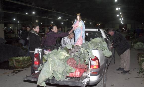 En un primer momento la camioneta sólo transportó la imagen de la Virgen. Pero a medida que avanzó, las lechugas, las ristras de ajo y otras verduras fueron llenando la caja del vehículo. Casi todos los puesteros se acercaron para dejar sus donaciones, pero además aprovecharon para agradecerle por las producciones ya que María Auxiliadora es la patrona del agro.