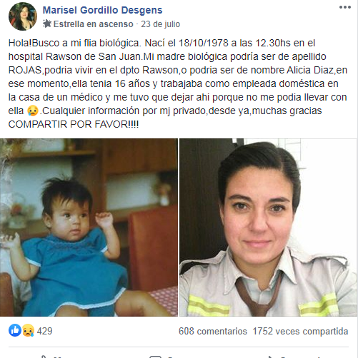 A esa consulta, le siguieron otras muchas que ella realizó con el fin de reconstruir su historia. Y ahora, con el apoyo de su madre adoptiva, de su pareja y de sus hijos fue más allá. Publicó su caso en el grupo de búsqueda de Facebook “Dónde estás?” e inició un recorrido que aún sigue en pie.
