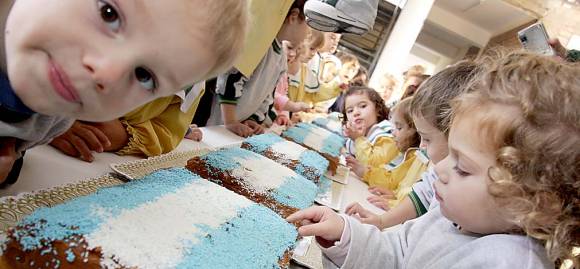 Los mesones fueron acomodados en fila india en la vereda del colegio Los Olivos, ubicado por Saturnino Sarassa entre Rioja y Tucumán. Sobre ellos pusieron, una al lado de la otra, las más de 100 tortas que habían hecho los alumnos junto a sus familias y que, adornadas con granas celestes y blancas, formaron una gran bandera comestible. Luego, cortaron la calle y toda la cuadra se transformó en la sede de un gran festejo popular. La idea era que los 350 alumnos y algunos padres, docentes y vecinos compartieran una mañana diferente. Y el motivo de tanto despliegue era una celebración especial: el cumpleaños de los 200 años de la Patria.