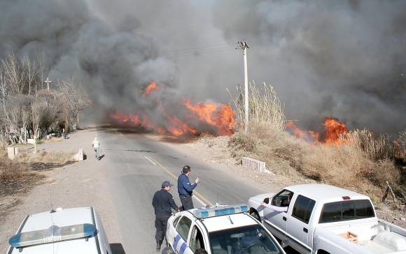 En El Medanito, el fuego avanzó hasta llegar a calle Abraham Tapia, con llamaradas que rápidamente cruzaron hacia el campo de enfrente. La Policía, en tanto, tuvo que cortar el tránsito a la altura de la UVT, porque no sólo había nula visibilidad por el humo, sino además por las impresionantes llamas que cruzaban la arteria.