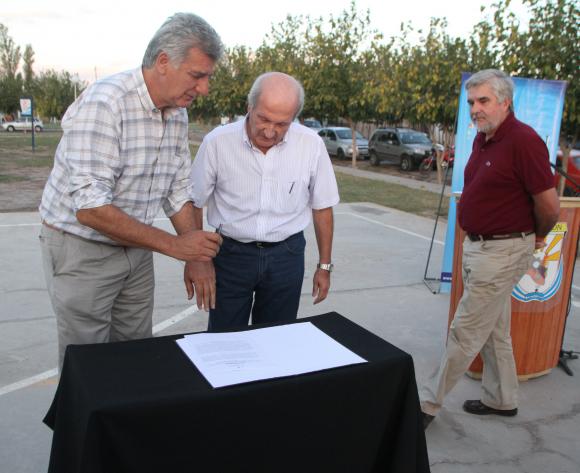 Ayer, cuando se firmó el convenio de obra, estuvieron presentes el intendente de Rawson Juan Carlos Gioja, el coordinador ejecutivo del Programa de Mejoramiento de Barrios, Martín Juncosa; Damián Escobar por parte de la empresa constructora, CICON SRL y los representantes de las uniones vecinales de los barrios.