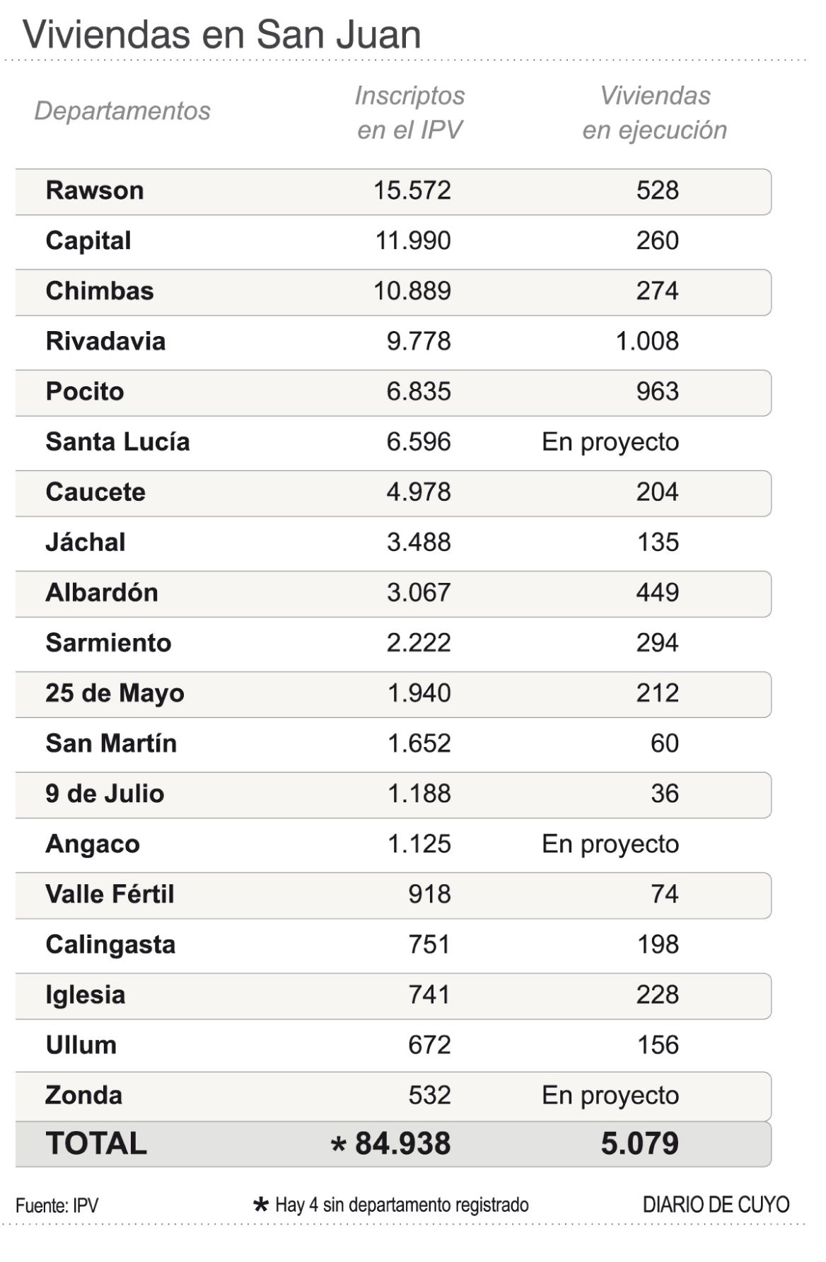 En la vereda de enfrente, los departamentos con menor cantidad de falencia en materia habitacional son Zonda, con 532 inscriptos en el IPV; Ullum, con 672; Iglesia, con 741; Calingasta, con 751 personas anotadas; y Valle Fértil, con 918.