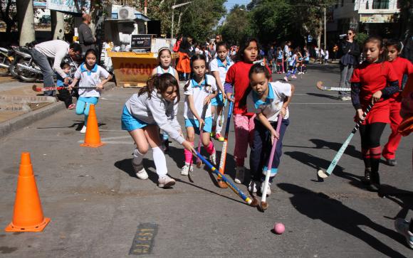 La avenida Ignacio de la Roza, entre General Acha y avenida Rioja se convirtió ayer en una inmensa cancha de hockey pista y más de 500 chicos jugaron hasta cansarse. Todo fue por una iniciativa de la Municipalidad de la Capital para promocionar la actividad que se encuentra en crecimiento. De la mañana hockística participaron clubes adheridos a la federación, equipos de colegios y municipales.