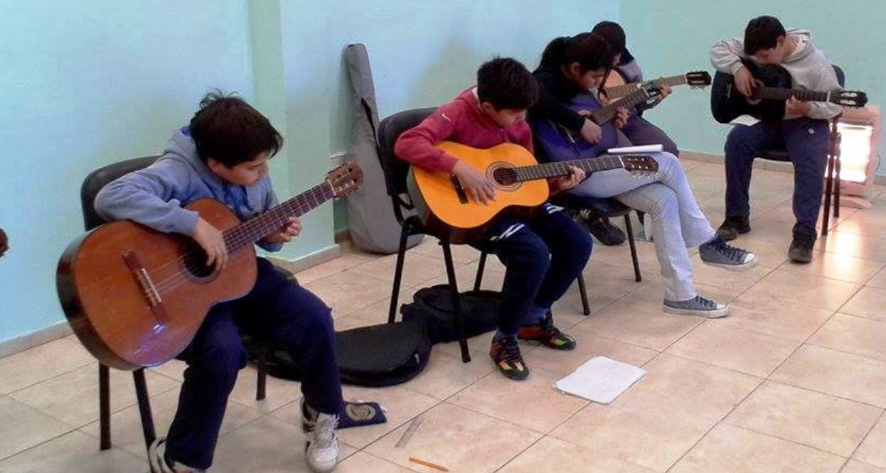 Entre los distintos talleres que se dictan están las clases de guitarra. A los chicos les prestan los instrumentos.