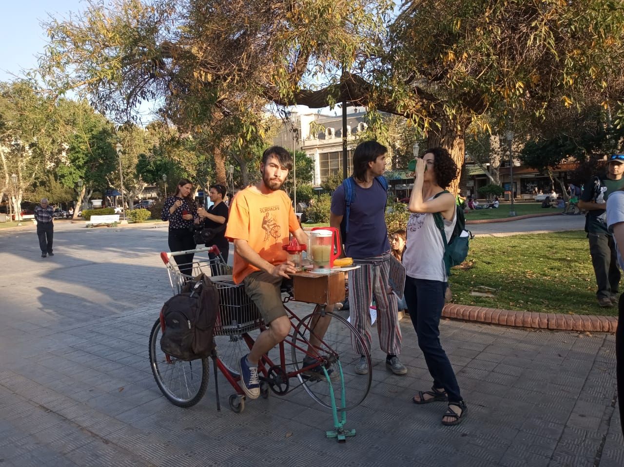 Un activista ingenió una curiosa bicicleta que, unida a una licuadora, hace jugos naturales para los marchantes. El mecanismo es sencillo, es el mismo que usan los afiladores, y la idea es furor entre veganos y ambientalistas. Santiago también realiza talleres sobre mecánica de las bicicletas, así como también de reciclaje y compostaje.