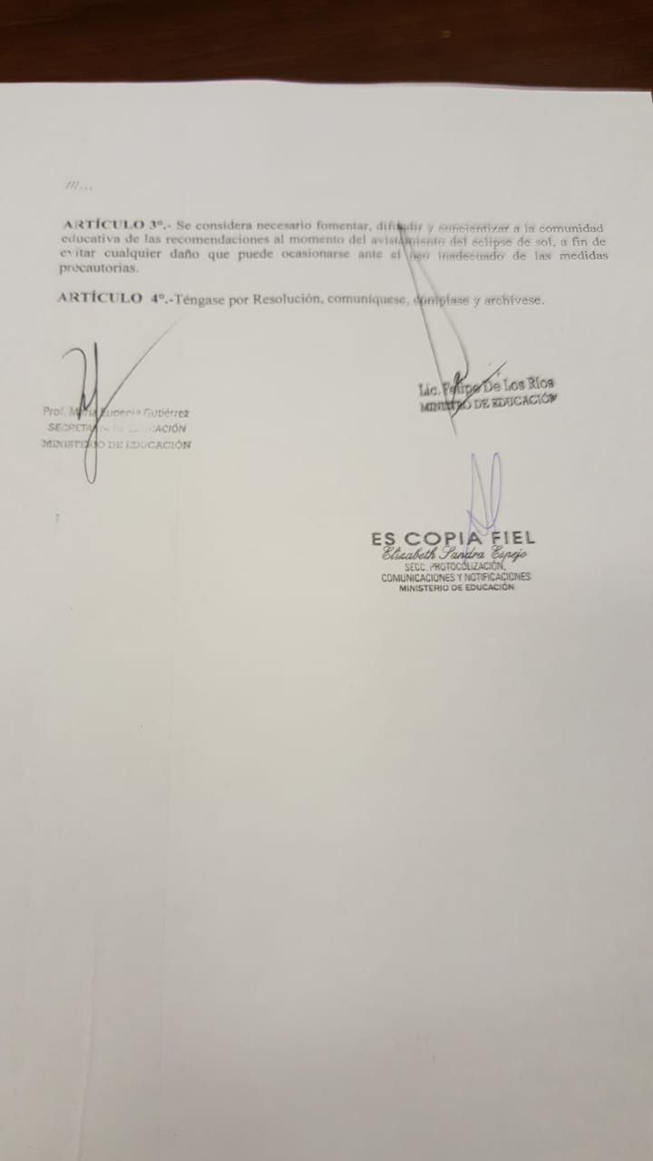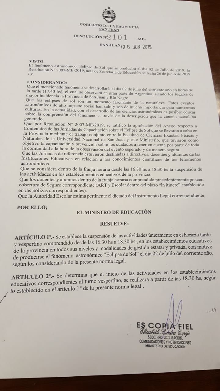 La medida fue comunciada este miércoles por la tarde bajo el argumento que "atento a la gran expectativa de la comunidad por participar de las diversas actividades organizadas para observar el eclipse" es que "el Ministerio de Educación dispuso la suspensión de actividades solo en la franja horaria comprendida entre las 16.30 a las 18.30".