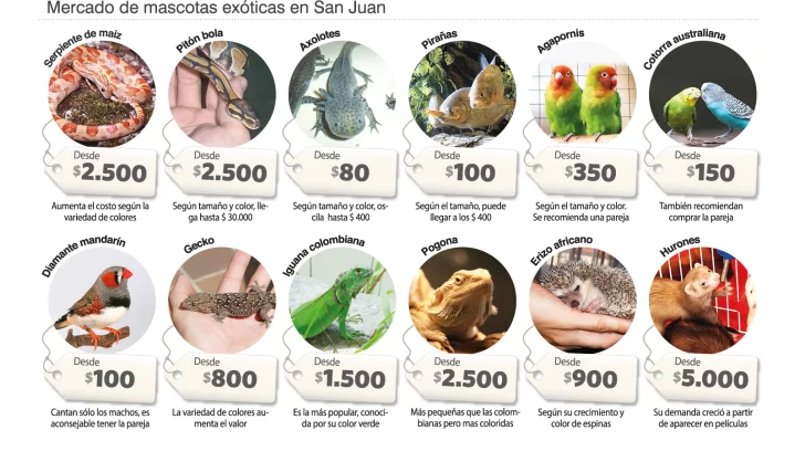 El veterinario y criador Aldo ’Pirata’ Olivares Robledal, referente ineludible del tema en San Juan, sostiene que en este momento la mayor demanda de animales exóticos apunta a serpientes, lagartos y psitácidos, es decir la gran familia de los loros. Entre las primeras, la pitón bola y la serpiente del maíz son las más buscadas. También las molorus tienen su mercado, pero como estas pitones pueden medir hasta 5 metros son preferidas las anteriores, que no alcanzan los 1,80 metros.