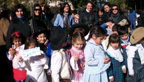 Los pequeños, vestidos con trajes de época y guiados por docentes y padres, se hicieron presentes en Plaza 25 de Mayo, el centro comercial, paradas de colectivos, puertas de entidades bancarias, entre otros.
