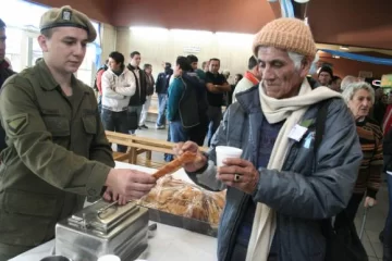 El vapor que salía de los vasos de mate cocido hirviendo invadió el lugar. Emilio Contreras no dudó en tomar un sorbo para calentar el cuerpo, mientras que su esposa formaba la fila para recibir una sopaipilla de la mano de los soldados del RIM 22. Esto sucedió pocos minutos después de que el matrimonio calingastino, que estaba apostado en el patio del hospital Rawson, escuchara la música de la Terminal de Omnibus y se cruzaron para ver qué pasaba. Fue cuando se dieron cuenta de que había una fiesta. Es que ayer, los empleados que trabajan en la Terminal que está en la ciudad, celebraron el Bicentenario con un desayuno bien patrio. Para la gente que pasó por el lugar, esto fue más que una bendición porque el mate cocido sirvió para paliar el frío de la mañana.