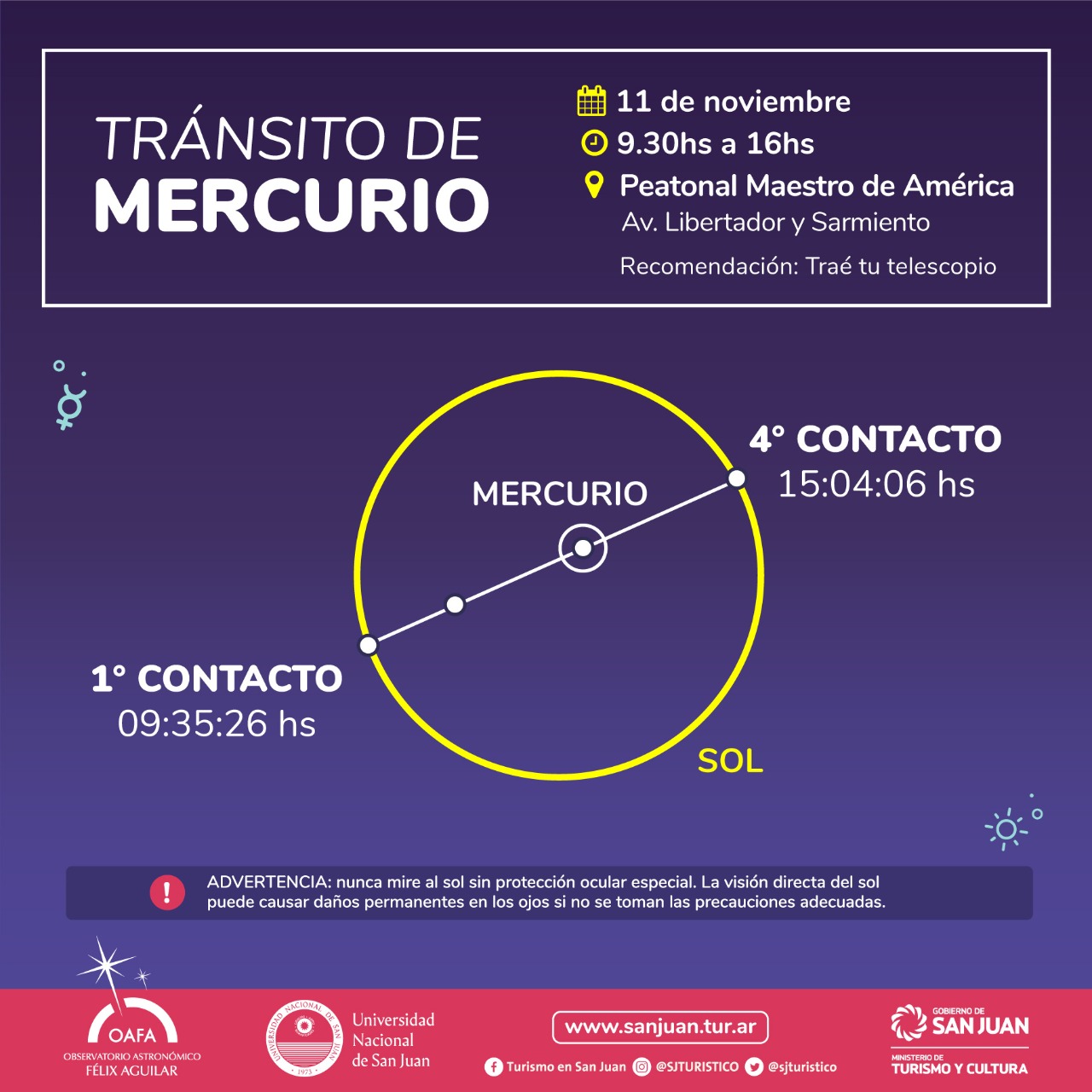 En ese contexto, el Ministerio de Turismo junto al Observatorio Félix Aguilar realizarán actividades didácticas en la Peatonal Maestro de América (Av. Libertador y Sarmiento) desde las 9.30 hasta las 16.