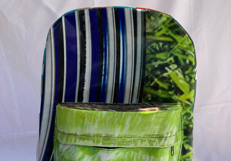 Mochilas y cartucheras con banners y telas recicladas, realizadas con gran creatividad. Las mochilas cuestan $900 y las cartucheras, de $300 a $250 según los tamaños. Redes: Instagram: trashbagsj. Facebook: TrashBag. Whatsapp: 2644044416.