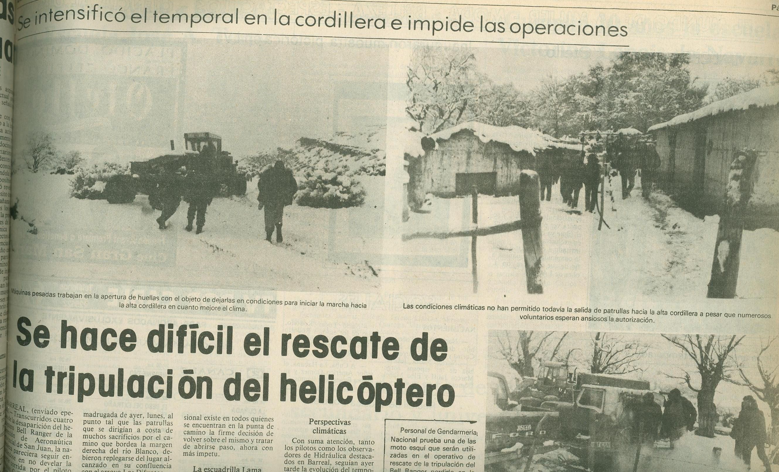 “Ese día escuchamos radios de Chile. Los grupos de rescate están al otro lado de los picos que veíamos antes que la tormenta los tapara. Era imposible llegar a donde estábamos porque la tormenta era cada vez más severa”, recuerda Gallardo en uno de sus escritos sobre el tema- La pequeña Tonomac que acompañaba a los empleados de Hidráulica se convirtió en la mejor aliada de aquellos hombres. Durante el día sólo podían escuchar radios del vecino país, pero por la noche las emisiones sanjuaninas de las radios AM eran dulce para aquellos oídos. “Escuchábamos como nos buscaban, como los locutores leían mensajes que dejaba la gente y eso nos llenaba de esperanza, pero también de angustia por no poder avisar que estábamos vivos”, contó Alberto. El titular de ese día daba cuenta de lo complicado que resultaba llegar al lugar. “Las intensas nevadas obligaron al repliegue de la patrulla terrestre”