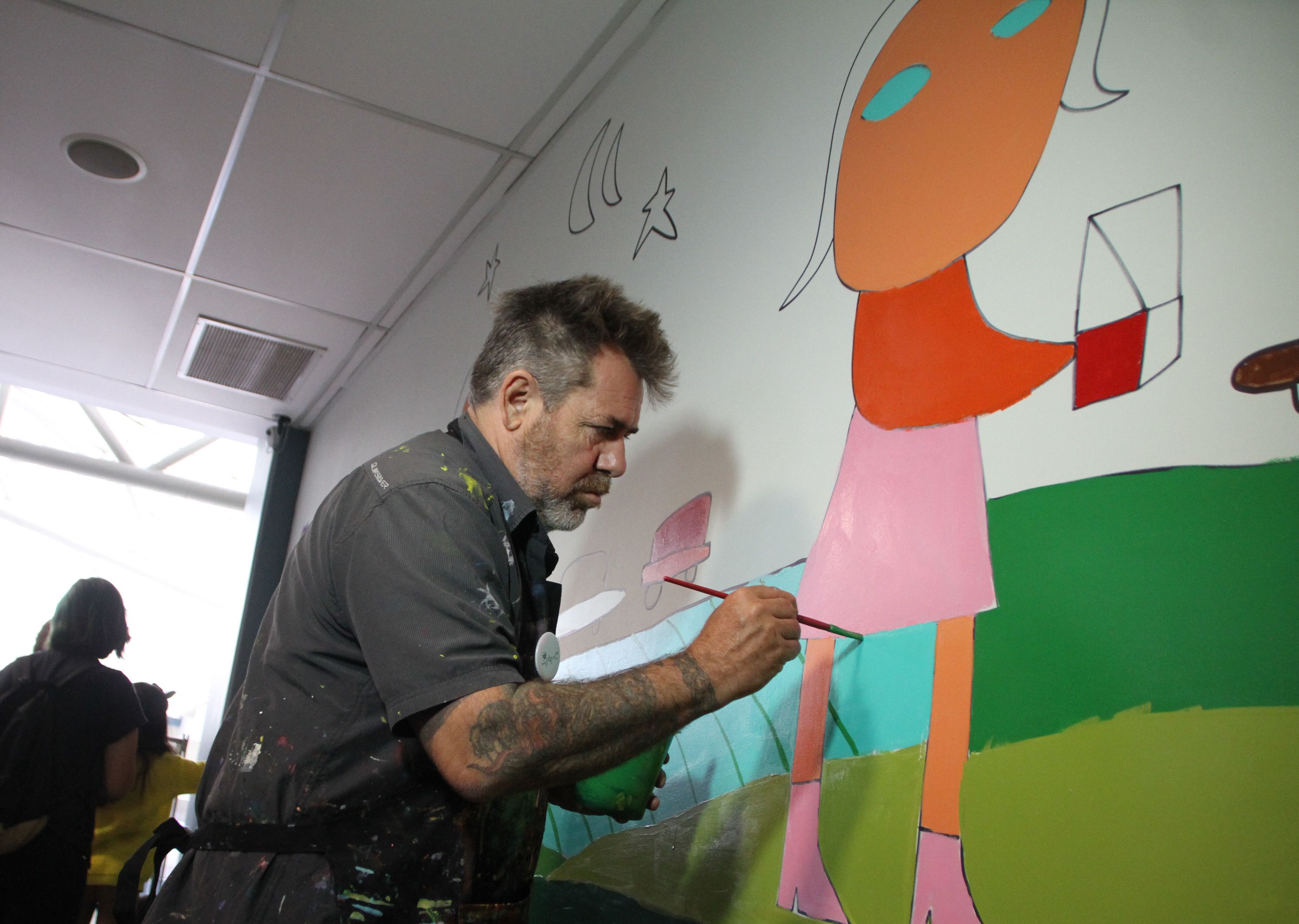 En unos pocos minutos el lugar pasó del blanco típico de una habitación de hospital a un mix de colores intensos que a simple vista transmiten vida y alegría. Fue la sala de espera de Onco-Hematología Pediátrica, del Hospital Rawson, a la que Milo Lockett le cambió la imagen. Ayer, el artista chaqueño pintó un mural en una de las paredes de esta sala y con valiosa ayuda de algunos niños que padecen cáncer y que se sintieron también protagonistas de este cambio. Esta obra se dio en el marco del Programa de Responsabilidad Social de la Municipalidad de la Capital y mediante un convenio que firmó con la Fundación El Otro y Fundame.