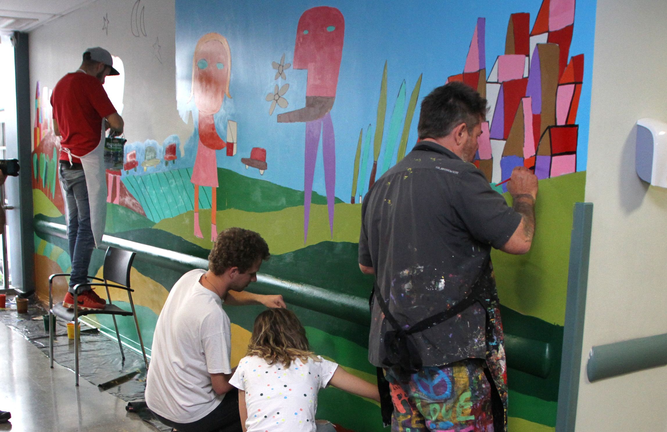 De a poco el mural invadió de color la sala de Onco-Hematología. En un espacio de 4 metros de alto por 3 de ancho Milo y los chicos pintaron una ciudad con niños de paseo y jugando en un día a pleno sol. Con esta imagen el artista cumplió el objetivo que busca plasmar a través de su arte: humanizar la medicina.