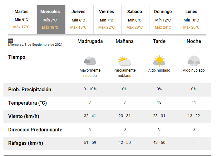 El cielo estará mayormente nublado en la mañana y se irá despejando durante la tarde, con la compañía del viento del cuadrante sur con una velocidad entre 42 a 50 km/h.