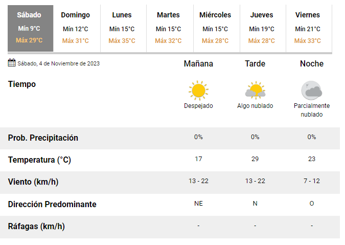 La jornada se presentará con una máxima de 29°C mientras que la mínima caerá hasta los 9°C. El cielo estará despejado por la mañana y algo nublado por la tarde-noche. Además, el viento provendrá del sector noreste por la mañana, rotando al norte y cerrando el día del sector oeste.