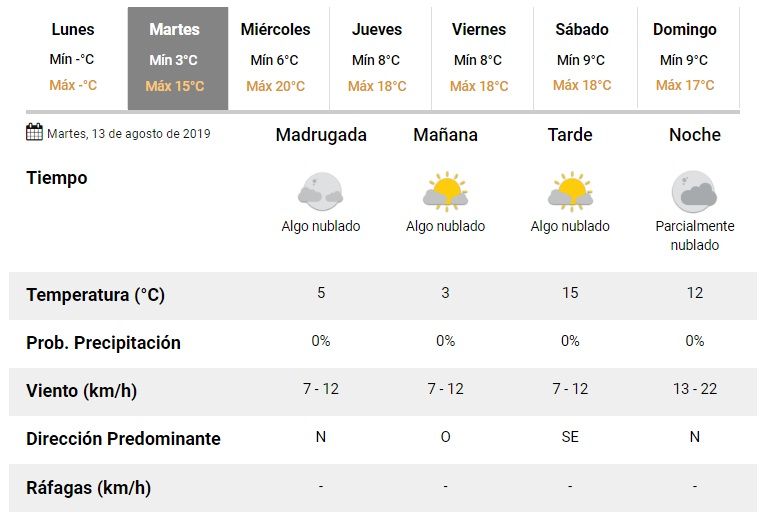 El Servicio Meteorológico Nacional ha previsto para este martes que la máxima ascienda hasta los 15°C mientras que la mínima caerá hasta los 3°C.