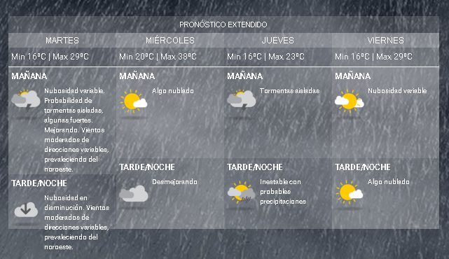 Para el miércoles, la máxima aumentará hasta los 38ºC mientras que el jueves descenderá abruptamente hasta los 23ºC. El viernes, la máxima será de 29ºC.