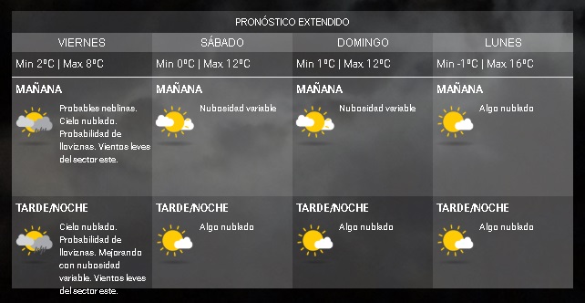 Para sábado y domingo, la máxima sube un poco a 12ºC mientras que la mínima será de 0 y 1 grado, respectivamente, con nubosidad variable.