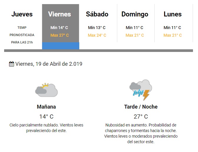 Las temperaturas cálidas se despiden por algunos días y las jornadas frescas comienzan a tomar protagonismo. Desde el Servicio Meteorológico Nacional han informado que para este viernes Santo, la máxima ascenderá hasta los 27°C mientras que la mínima será de 14°C.