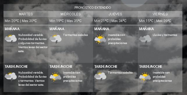 Este martes, feriado por Carnaval, la máxima trepará hasta los 30ºC mientras que la mínima caerá hasta los 20ºC.