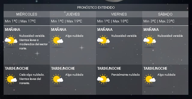 Por su parte, estiman que para el jueves y viernes la mínima se mantenga pero la máxima tendrá un leve suba hasta los 19ºC y 18ºC, respectivamente.